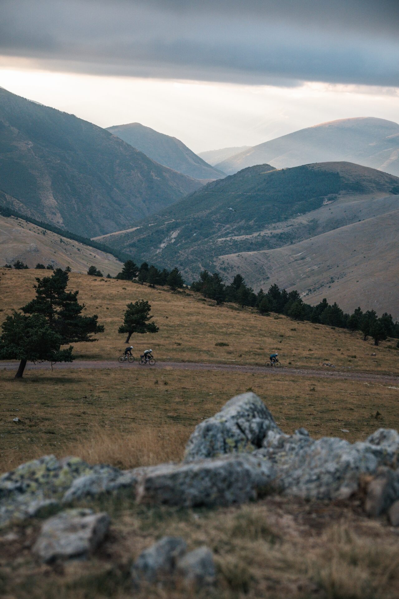 Climbing again, our energy returned. At Muro de Aguas, we lay on the ground for 20 minutes, letting the fatigue settle before tackling the next set of climbs. Dinner in Enciso, a sandwich to go, and then one of the most beautiful moments of the ride: a gravel climb at dusk, panoramic views, and a rollercoaster above 1,500 meters of elevation through a corridor of wind turbines.