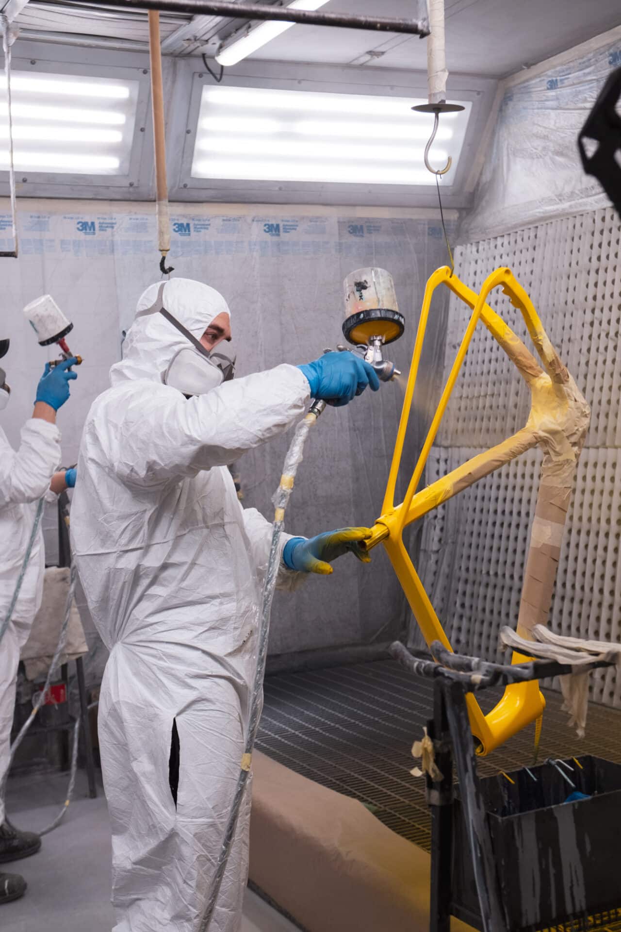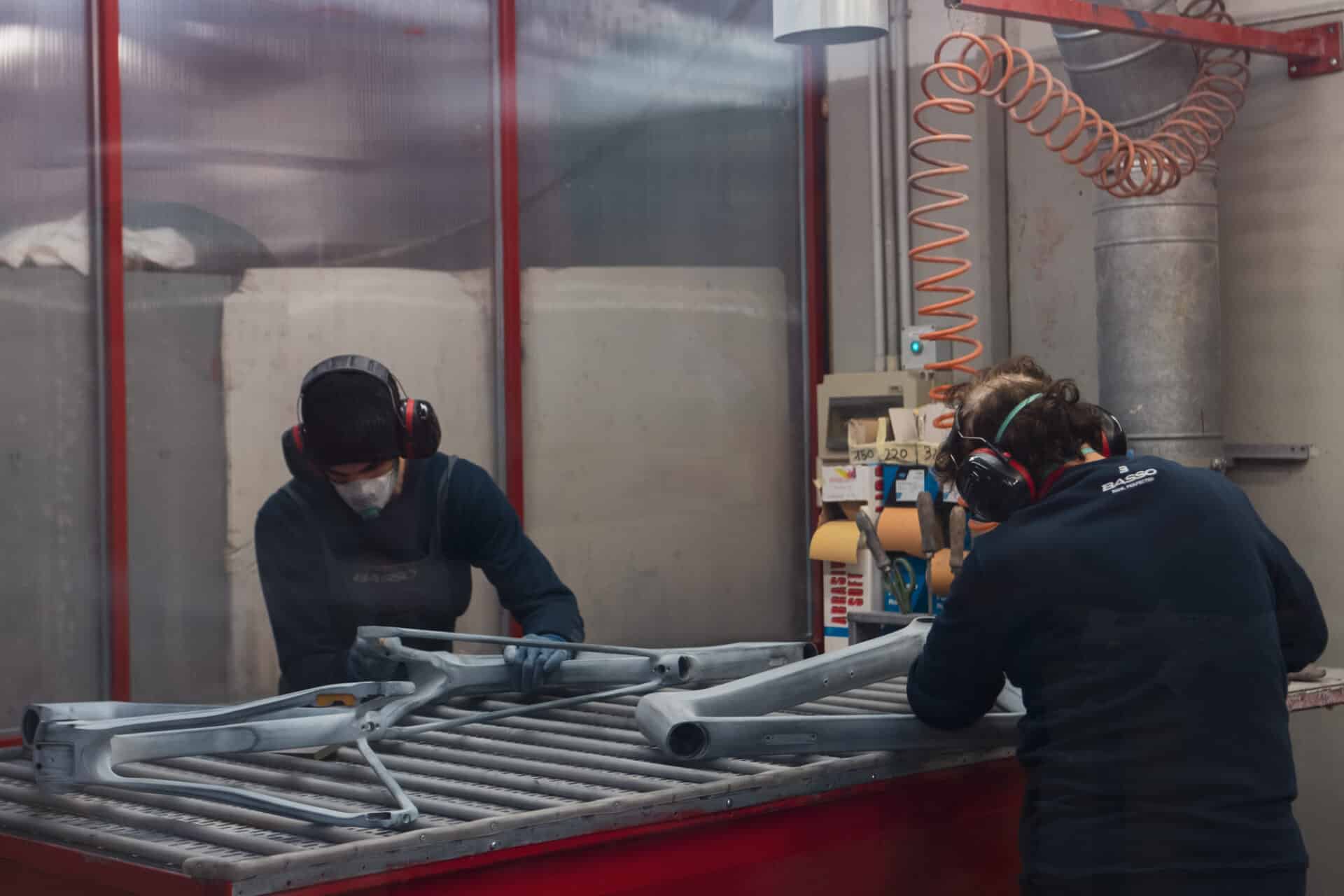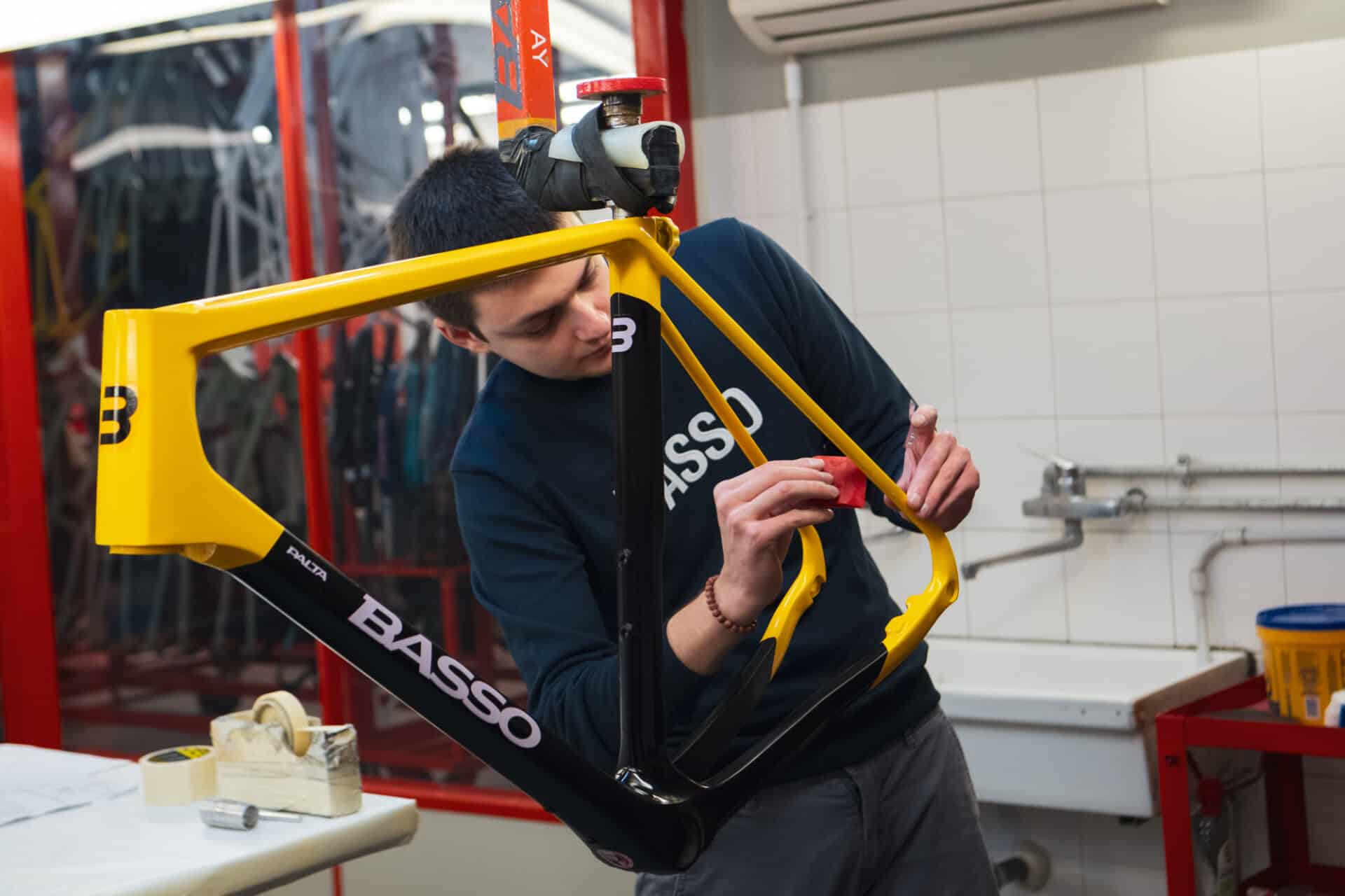 Pintan alrededor de 35 cuadros por turno, trabajando dos turnos al día. Algunos modelos de bicicletas requieren más tiempo, y lanzamientos recientes como la nuevo Basso SV desafían constantemente a los trabajadores con nuevas técnicas de pintura. Es importante destacar que solo se utilizan pinturas a base de agua y que los empleados se someten a controles de salud periódicos, lo que demuestra la convicción de Basso de proteger tanto al ciclista como al fabricante.