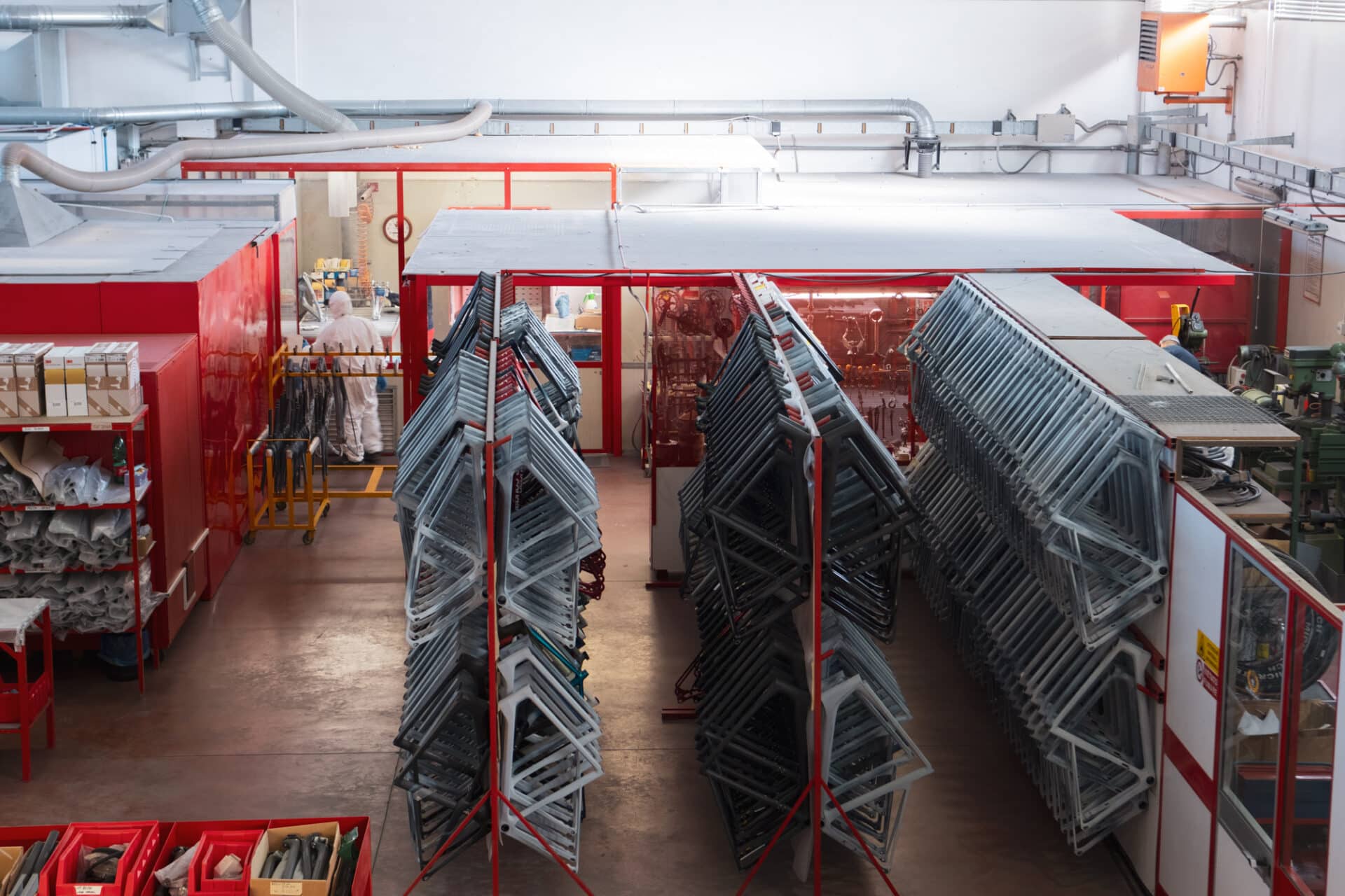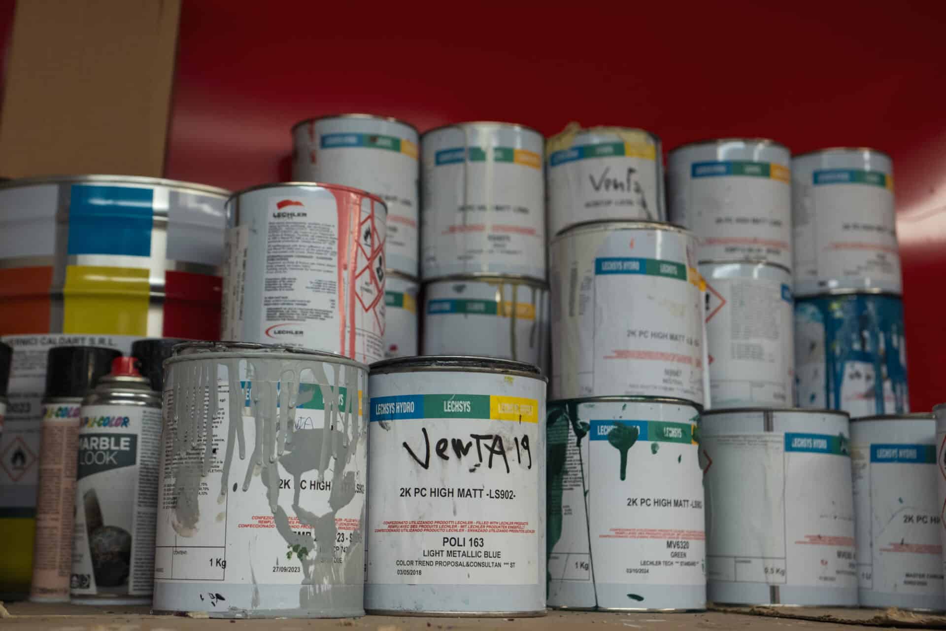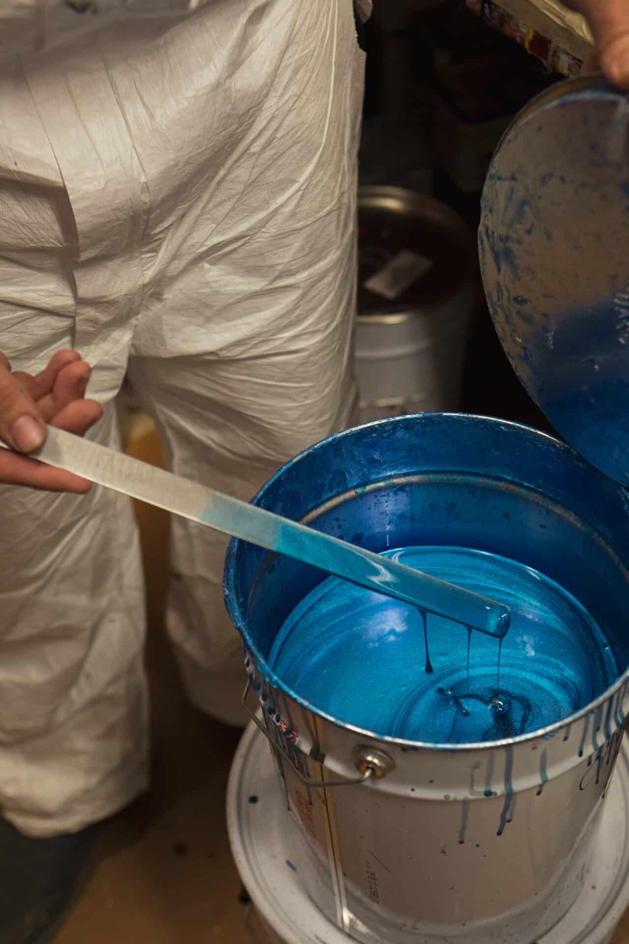 Los cuadros Basso se pintan actualmente en Vicenza, y en una mañana, nos presentaron todo el proceso: imprimación, horno, adhesivos, capas de color y una comprobación final de la porosidad, todo en un solo día. La distribución de estas instalaciones se replicará en La Fabbrica.
