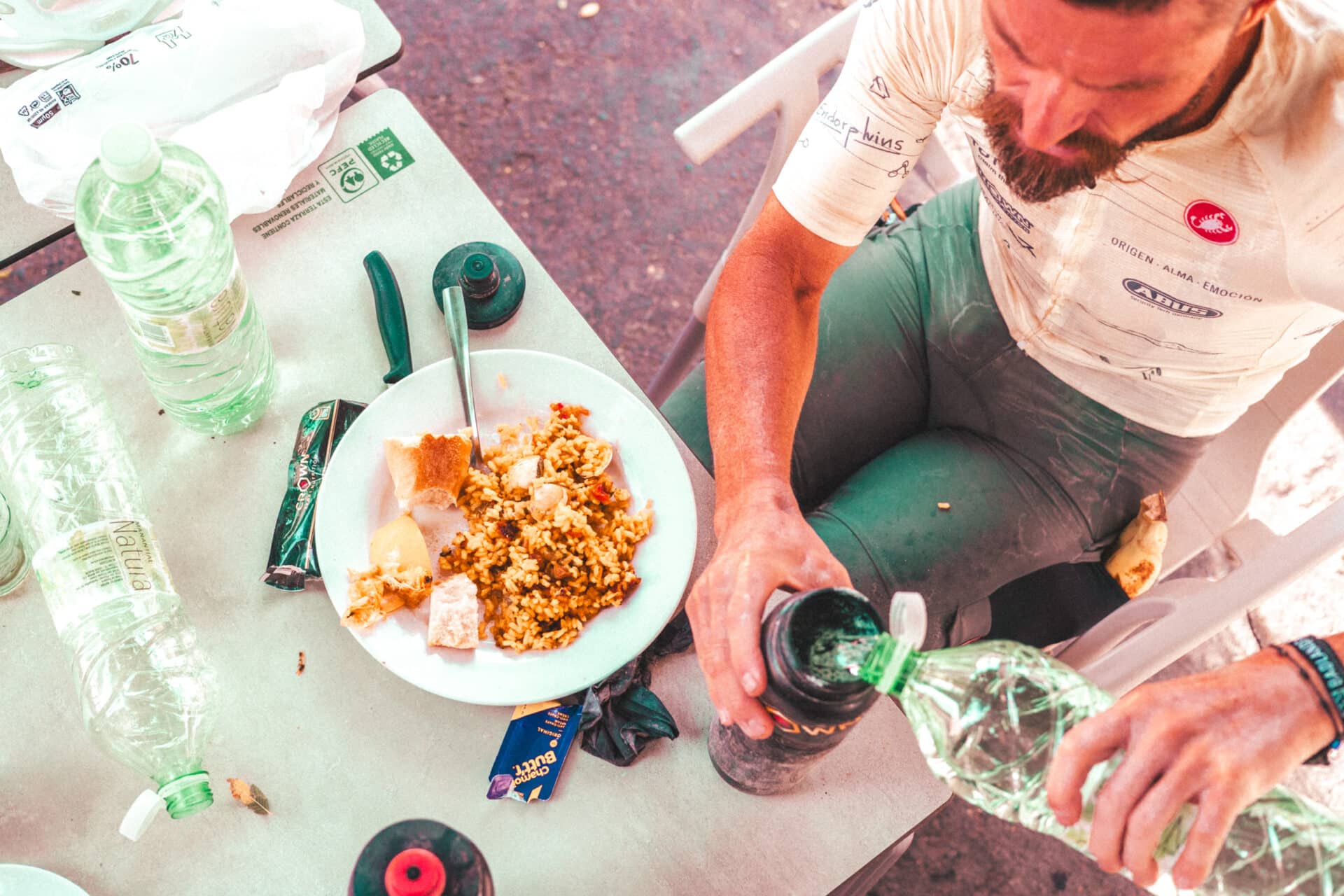 La mesa de Óscar. Ese mix de bocadillo y arroz, isotónico y comida ciclista, junto con crema para las rozaduras y un plátano en el bolsillo. Pura definición de ultraciclista.