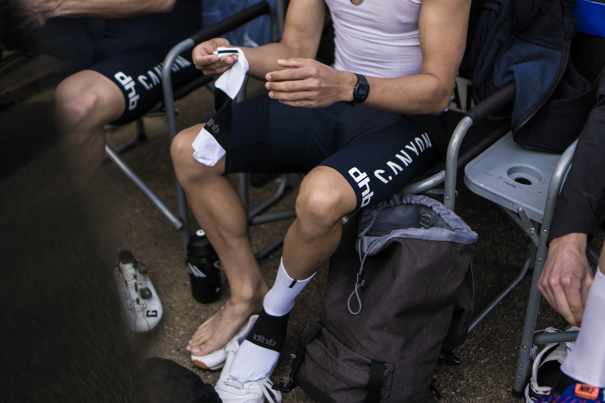 Los “desafortunados” en cambio tenían que asegurarse de tener todo listo en los momentos previos a la competición aunque, con la ayuda de los soigneurs que les esperaban, todo era más fácil. Fue en este momento que las manías y obsesiones por el detalle de determinados corredores se hizo notar; Max Stedman revisó no una sino dos veces los puentes de freno de su bici, y Callum Macleod, que olvidó su GPS, cubrió el soporte del manillar con cinta americana para evitar cualquier distracción. Es también curioso el amuleto de madera que el joven ciclista nacido en el año 2000 lleva en el interior de su casco y que luce desde hace muchos años.