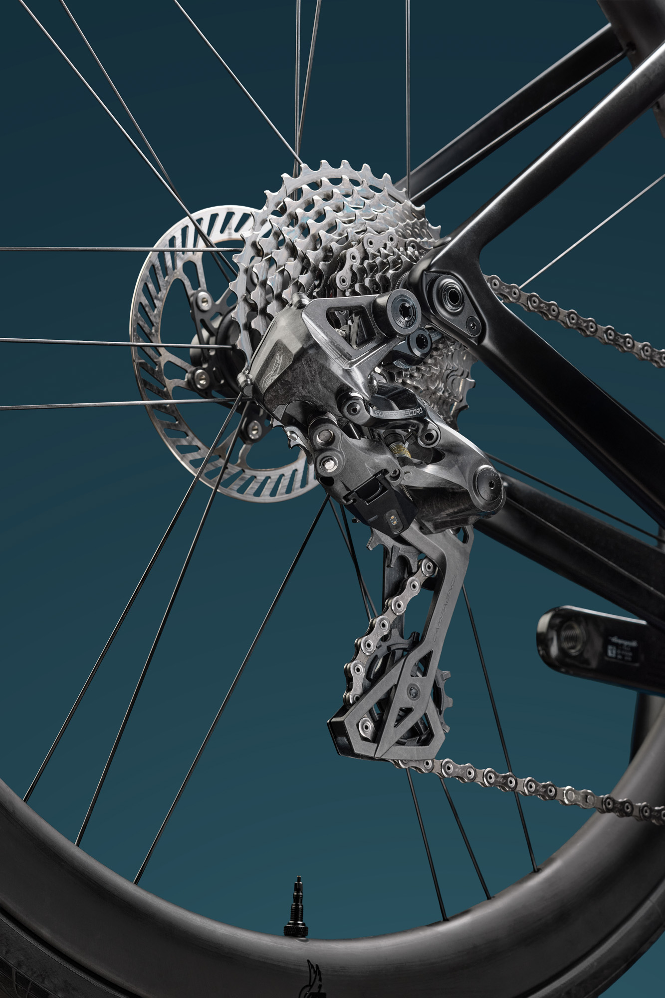 Entre los aspectos técnicos que más han llamado nuestra atención, encontramos el nuevo cambio trasero que, además de tener un mayor desviador compatible con piñones de hasta 48 dientes y un diseño reforzado, cuenta con Nano Clutch, un nuevo sistema diseñado para mantener la tensión correcta de la cadena en los terrenos más técnicos evitando que la cadena acabe fuera del plato. En cuanto a las bielas, se han rediseñado para ser más aerodinámicas y ofrecer un rango de platos de 38 a 52 dientes. Además, cuenta con la opción de incluir potenciómetro. Cabe destacar la solución que han optado para los mandos, dejando la maneta izquierda lo más simple posible y centrándose en la derecha para manejar toda la transmisión, una buena decisión para reducir peso y complejidad de los componentes.