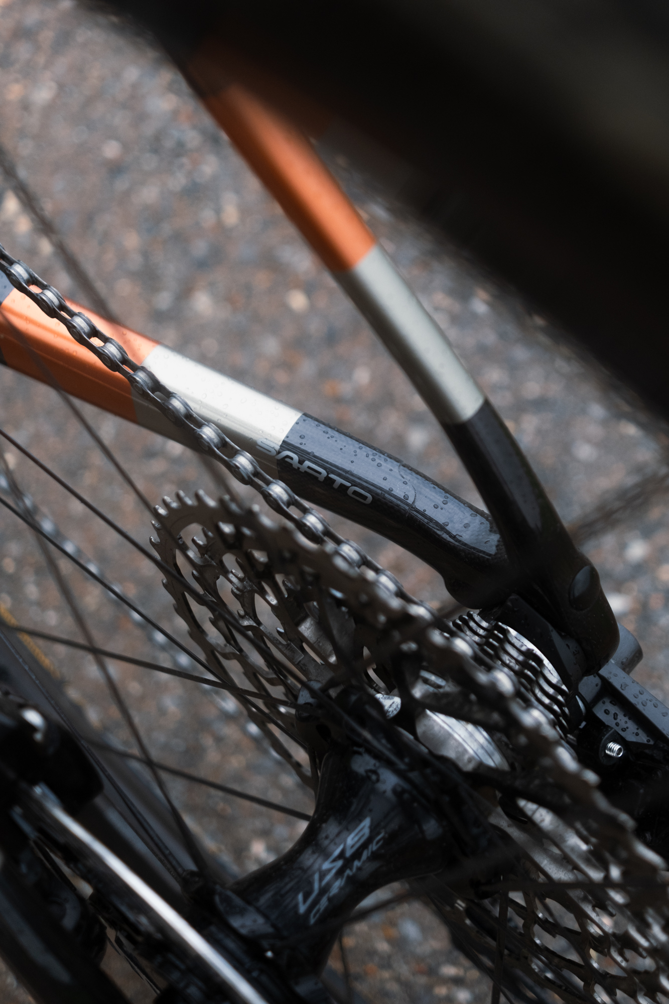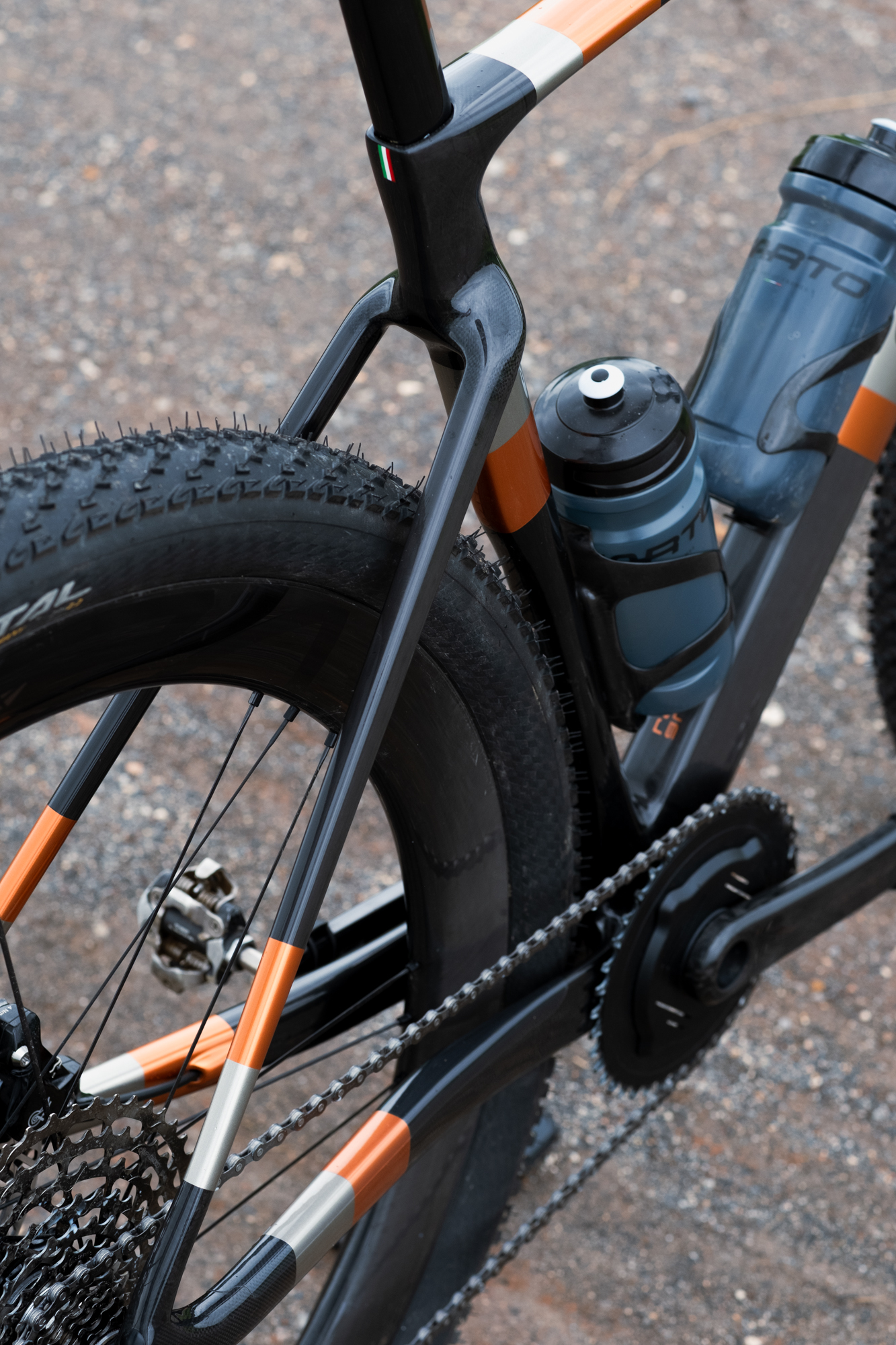 Lo primero que llama la atención de la Wide es el tamaño de su paso de rueda, preparado para montar neumáticos de hasta 48 mm con una transmisión 2x o de hasta 56 mm si optas por una transmisión monoplato. Si nos centramos en esta última opción, ya estamos hablando de medidas de neumáticos más típicas de MTB que de Gravel, pero en muchas de las competiciones de referencia de la escena actual, cada vez es más habitual encontrar corredores que las usan.