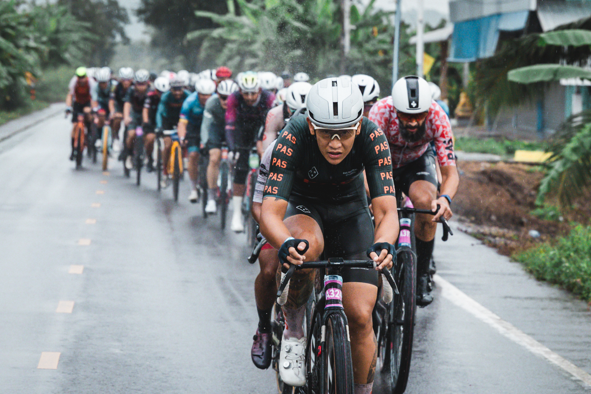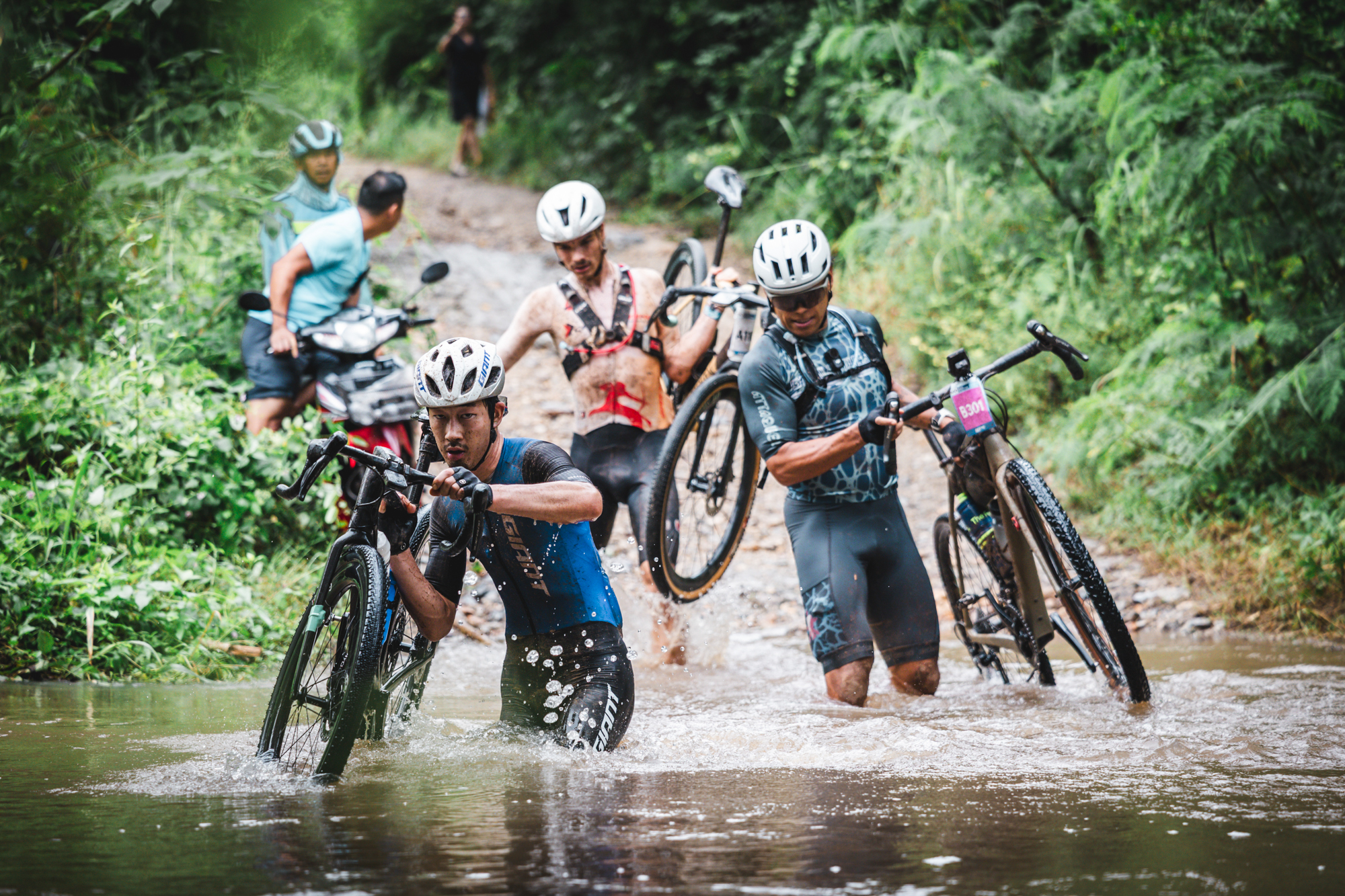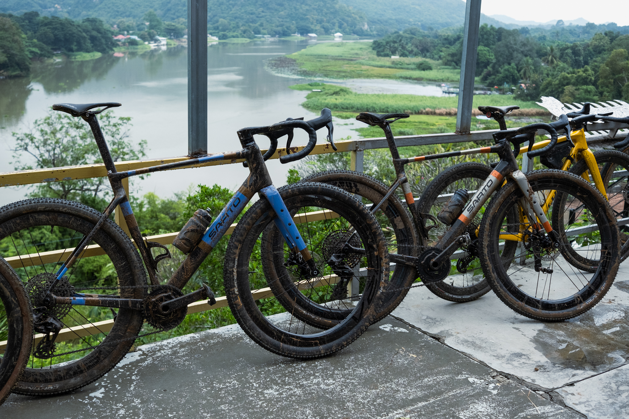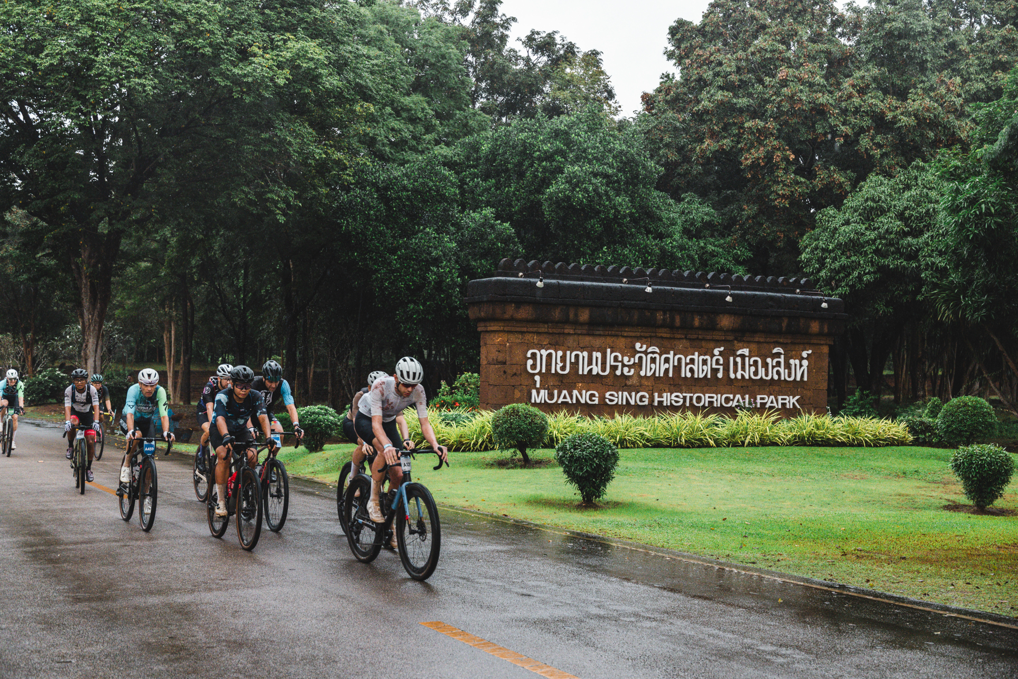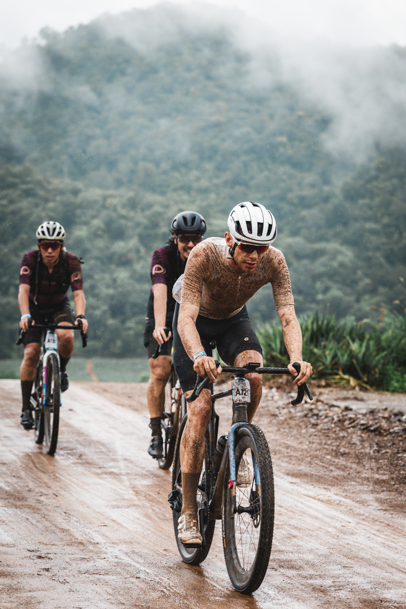 We woke up at 4:00 a.m. on Saturday and boarded a shuttle to Mueang Sing Historical Park, where the race started at 7:00 a.m. In the dark and still under rain, we made the final tire pressure adjustments on our bikes. Luckily, the Sarto Raso Wide bikes we were exclusively using for this race were equipped with the new Campagnolo Bora X wheels and 55 mm tires, which would be a great help on such a demanding course. Matching the wheels, a Campagnolo Super Record X groupset, single chainring and 13 speeds also helped reduce drivetrain issues.