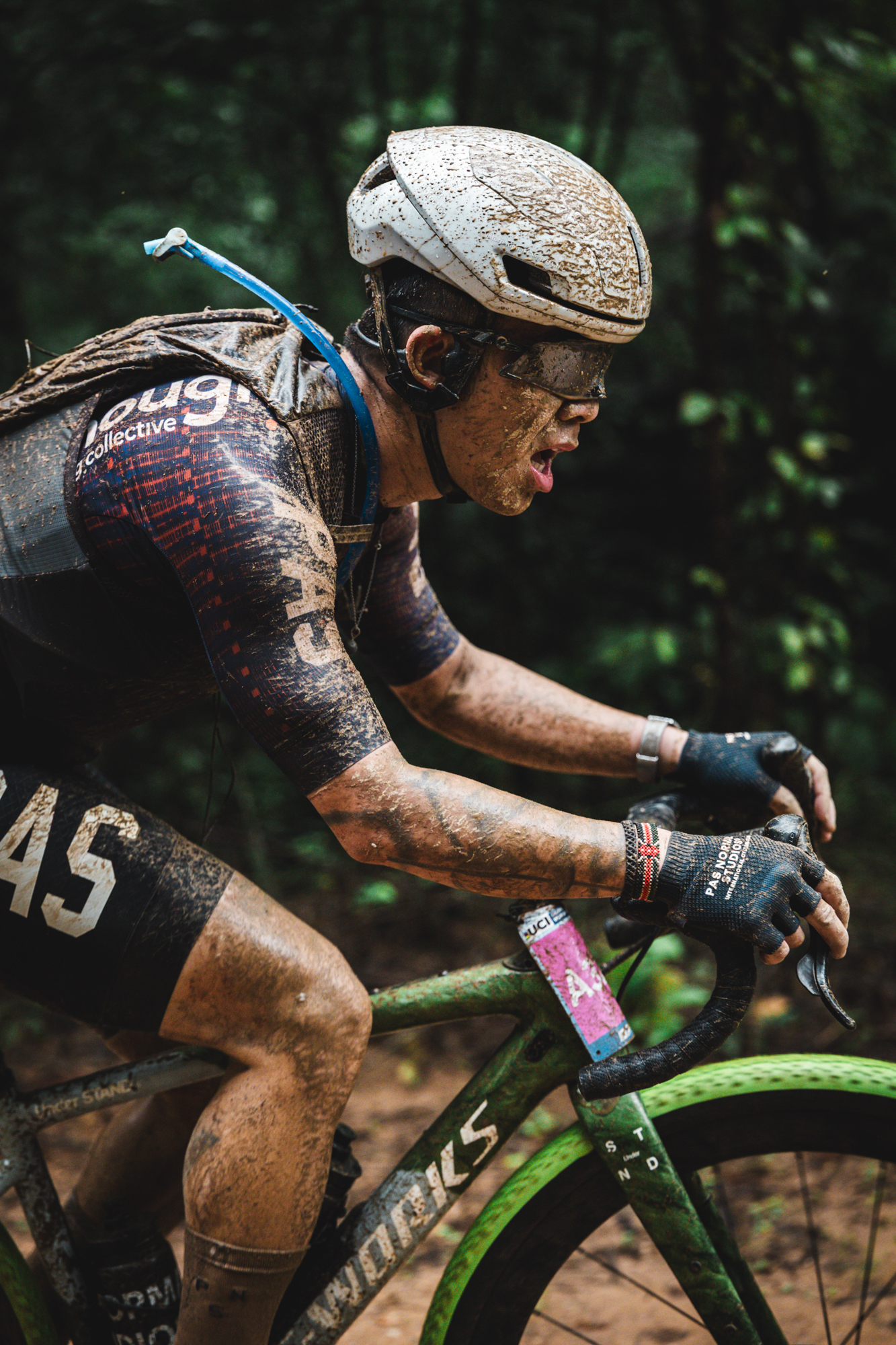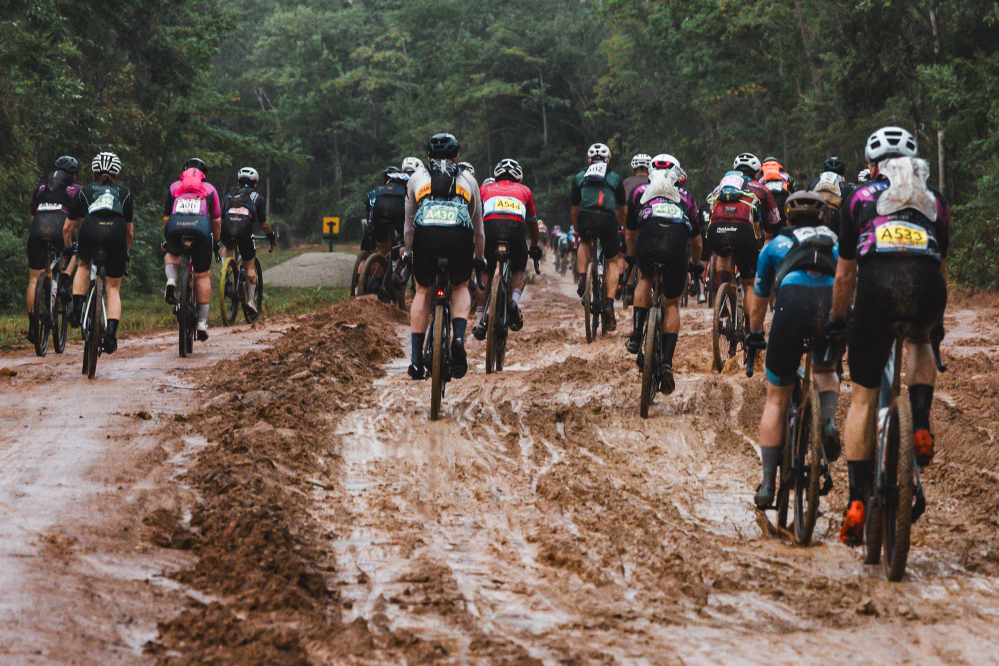 Mud and countless puddles covered the path. Riders tried to dodge obstacles and find the best line at high speed. From that point, the lead group broke into smaller packs of three or four riders, each finding their own pace and doing their best to handle the rough terrain.