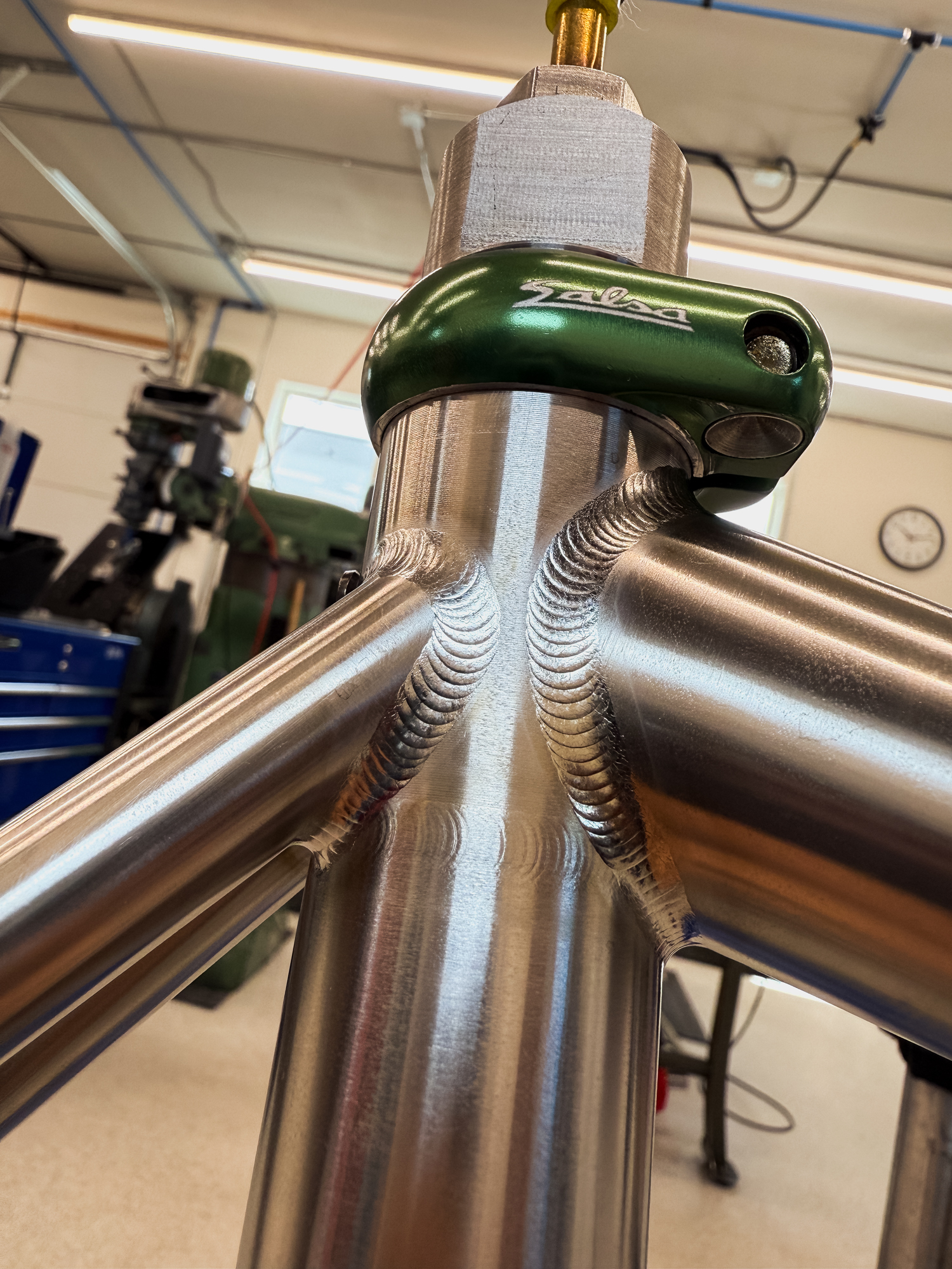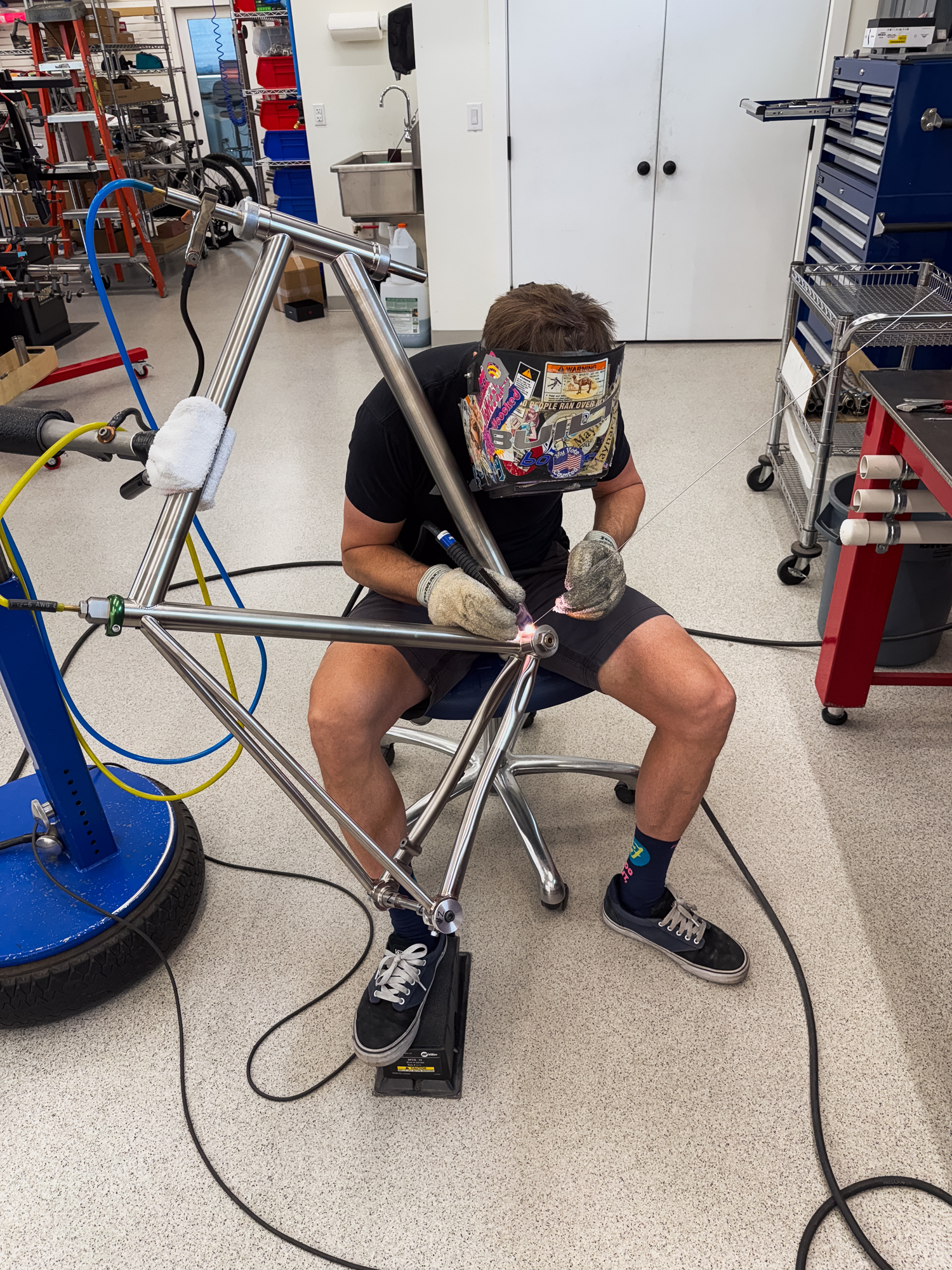 The finishing work was a lesson in itself — from sandblasting, reaming, and taking care of every detail that titanium in its unfriendly nature demands. Beyond just building, Brad’s connection with his clients made an impression on me. He is as committed to their experience as he is to the precision of his welds. Another takeaway from visiting Brad was the power of the people around him. Between his wife, Hanna, and his assistant, Jon, I could feel the strength of his support system.